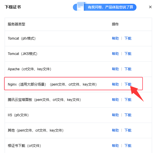 弹出来的有很多服务器类型,我们之前服务器是安装的Nginx ,所以这里我们选择Nginx后面的下载。