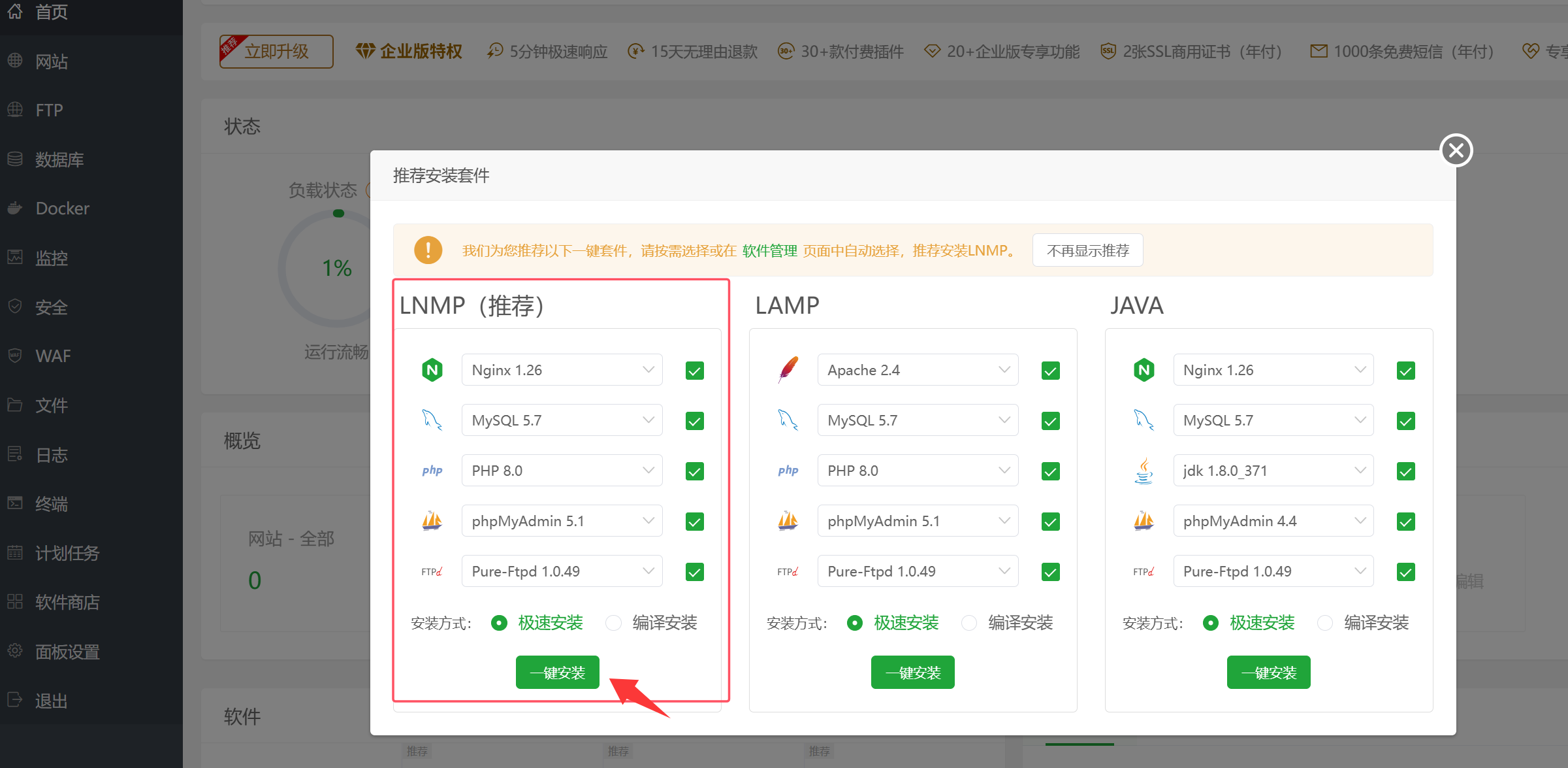 登录后,首次进入界面,会自动弹出一个安装提示。就是提示你 安装服务器环境 的,它给你准备了三个套件,可以一键安装好这些服务,帮你快速搭建起想要的服务器环境。