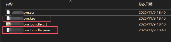 然后将下载的压缩包解压,得到下面的文件,我们需要的是后缀为.key和.pem的这两个文件。