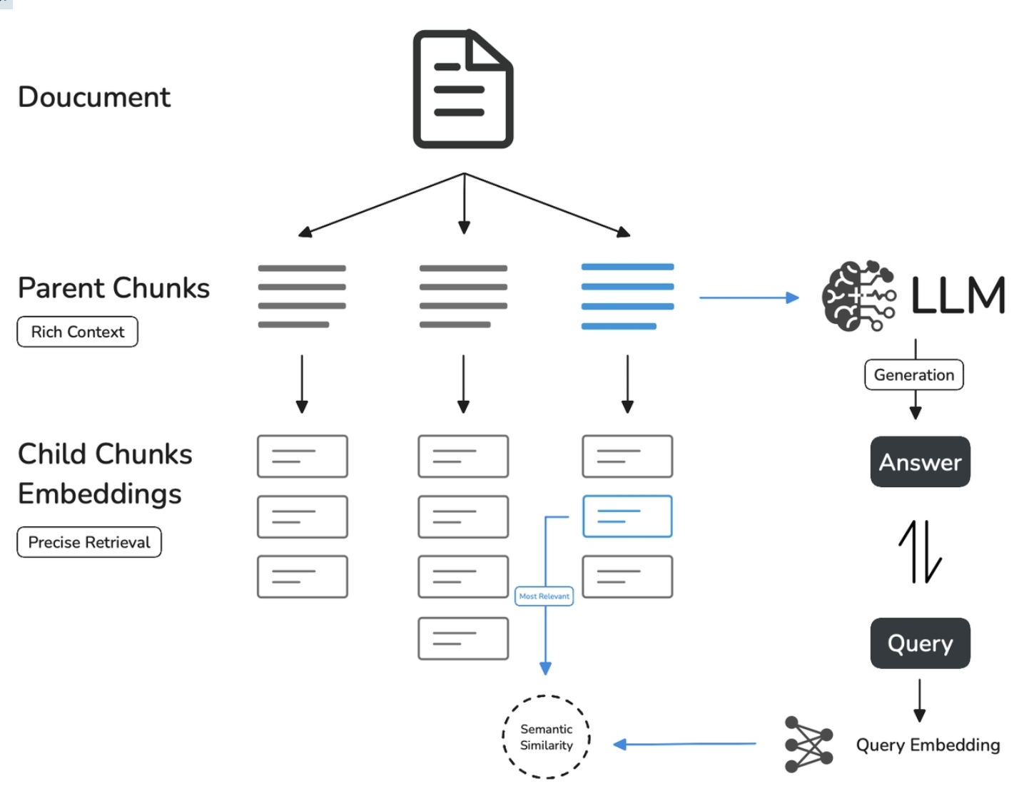- 将包含匹配子分段的更大部分(如段落、章节甚至整个文档)视作父分段并提供给大语言模型(LLM)。