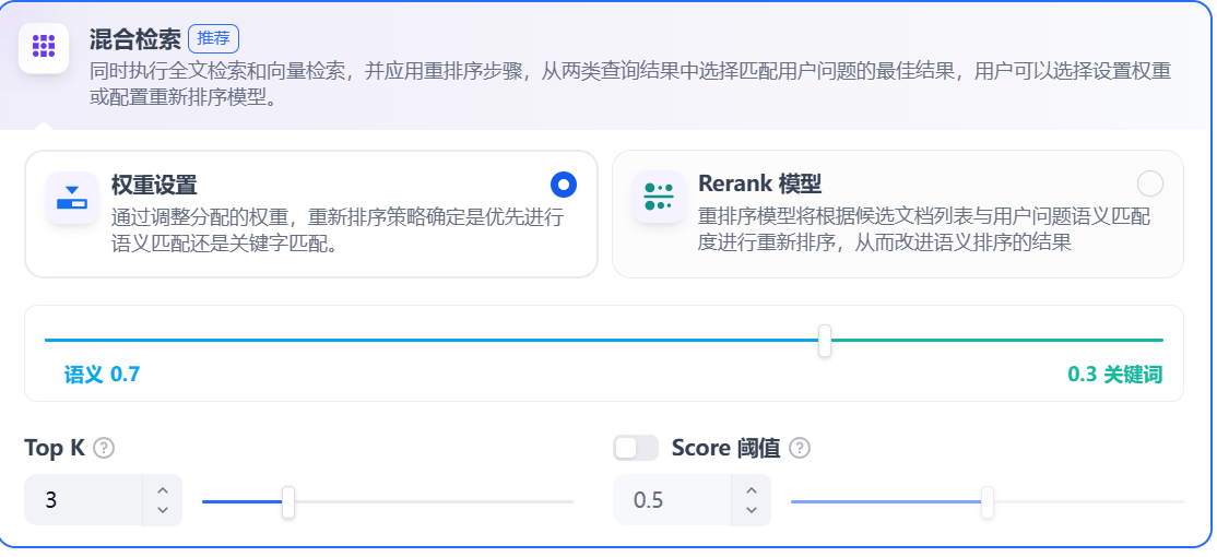 在混合检索设置内可以选择启用 “权重设置” 或 “Rerank 模型”。
