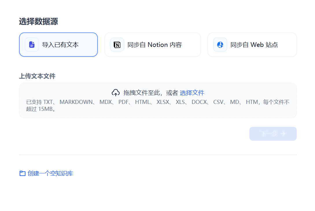 进入知识库创建页面,选择数据源,选择导入已有文本。目前文本支持多种数据类型TXT、 MARKDOWN、 MDX、 PDF、 HTML、 XLSX、 XLS、 DOCX、 CSV、 MD、 HTM