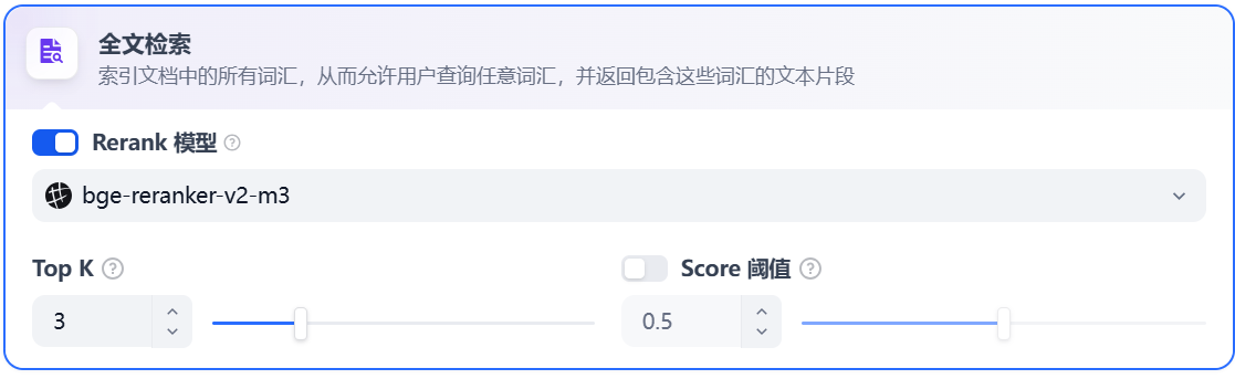 TopK 和 Score 设置仅在 Rerank 步骤生效,因此需要添加并开启 Rerank 模型才能应用两者中的设置参数。
