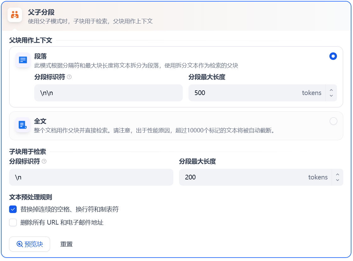 其中,父区块(Parent-chunk)保持较大的文本单位(如段落),提供丰富的上下文信息;子区块(Child-chunk)则是较小的文本单位(如句子),用于精确检索。系统首先通过子区块进行精确检索以确保相关性,然后获取对应的父区块来补充上下文信息,从而在生成响应时既保证准确性又能提供完整的背景信息。你可以通过设置分隔符和最大长度来自定义父子区块的分段方式。