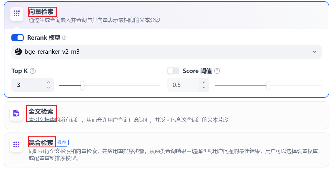将内容块向量化并录入至数据库后,需要通过有效的检索方式调取与用户问题相匹配的内容块。高质量模式提供向量检索、全文检索和混合检索三种检索设置。