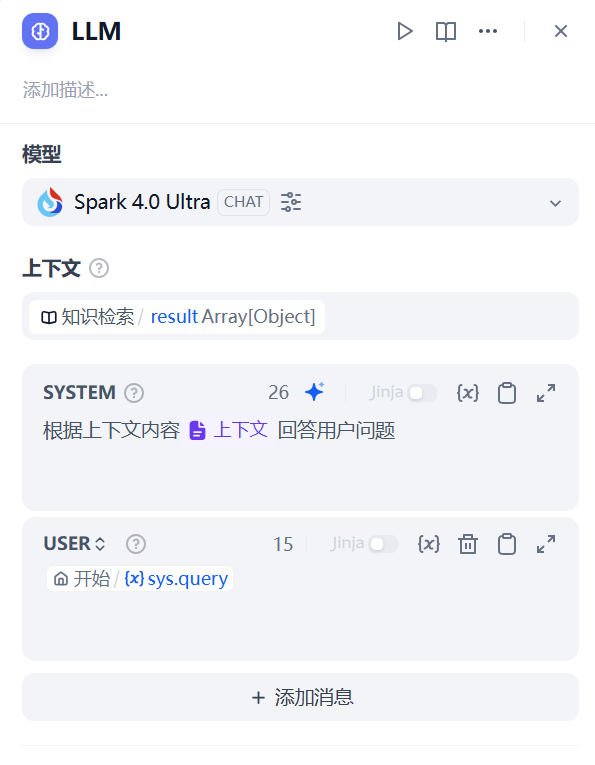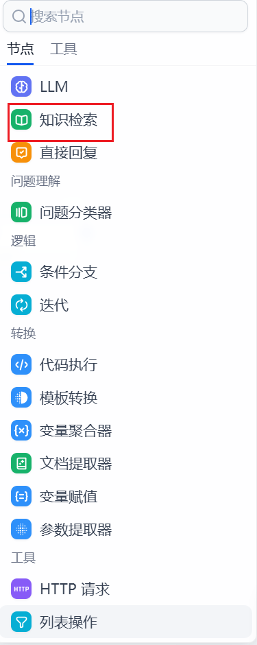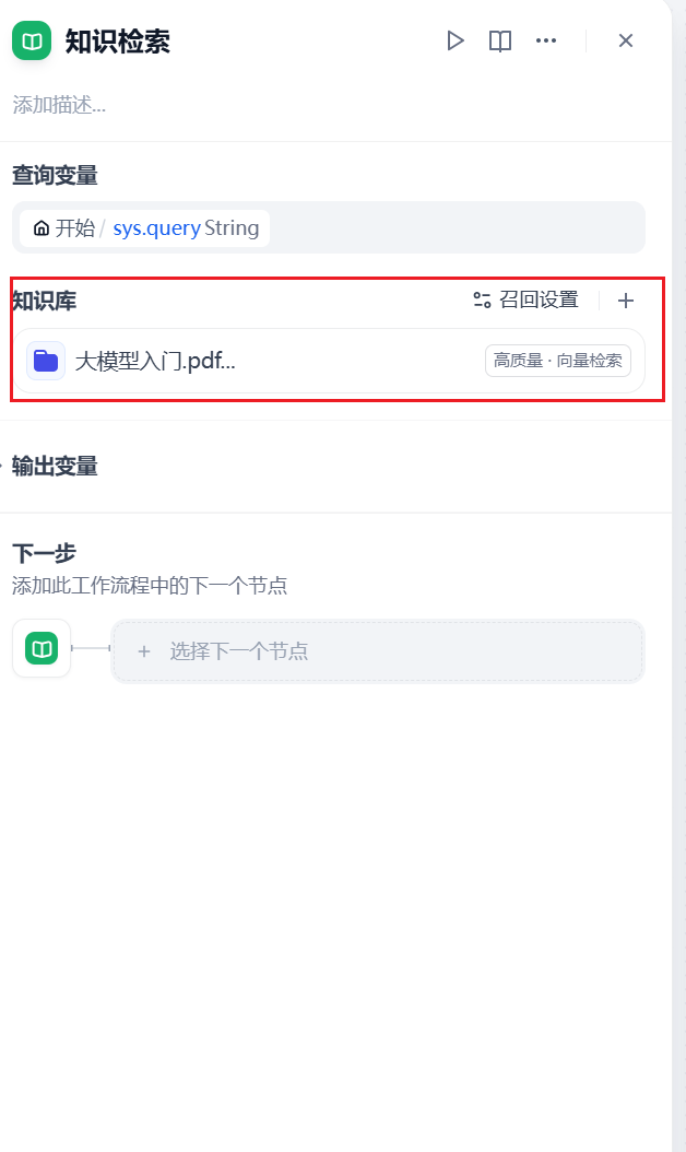 进入工作流创造面板中,我们可以在大语言模型中间节点中添加“知识检索”
