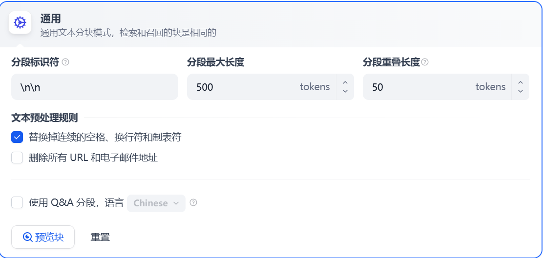 \n,即按照文章段落进行分块。 - 分段最大长度,指定分段内的文本字符数最大上限,超出该长度时将强制分段。默认值为 500 Tokens,分段长度的最大上限为 4000 Tokens;