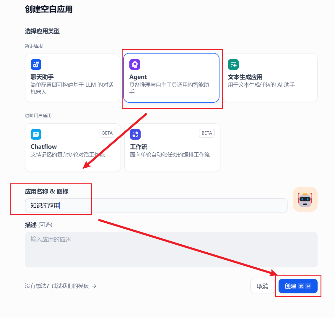 点击创建空白页面、选择Agent ,给这个Agent 应用一个名字
