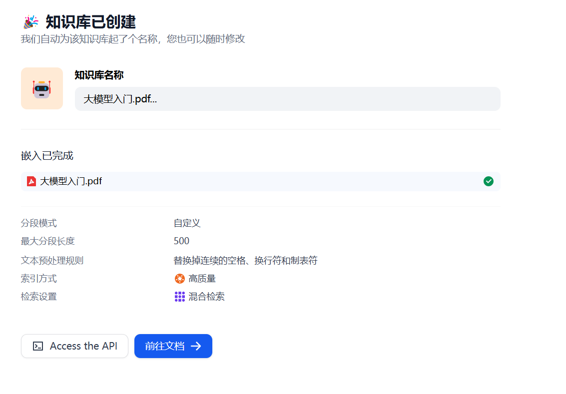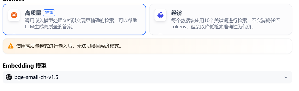 在高质量模式下,使用 Embedding 嵌入模型将已分段的文本块转换为数字向量,帮助更加有效地压缩与存储大量文本信息;使得用户问题与文本之间的匹配能够更加精准。