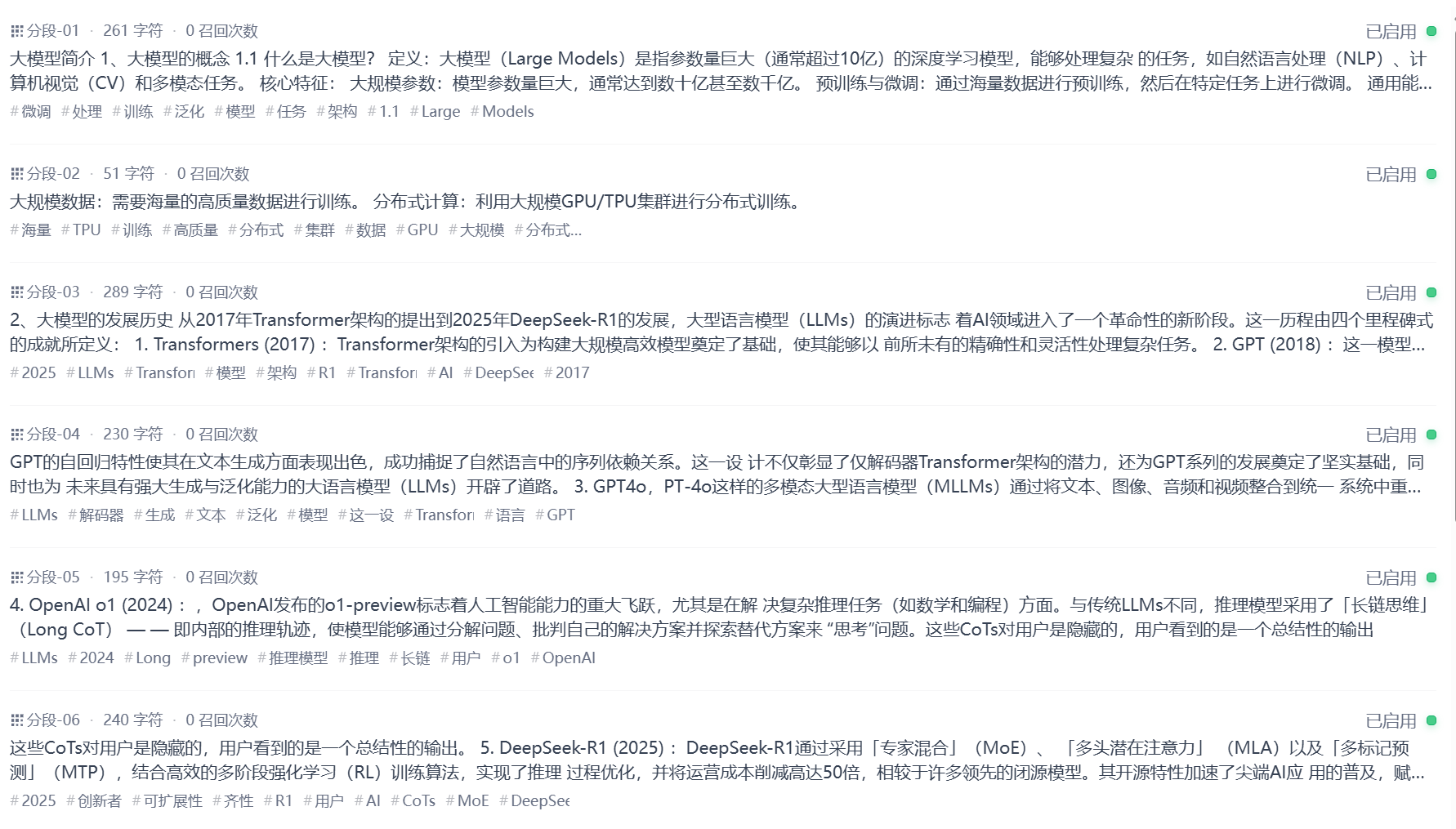 配置完成后,点击“预览区块”即可查看分段后的效果。你可以直观的看到每个区块的字符数。如果重新修改了分段规则,需要重新点击按钮以查看新的内容分段。