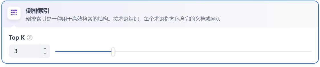 在经济索引方式下,仅提供倒排索引方式。这是一种用于快速检索文档中关键词的索引结构,常用于在线搜索引擎。倒排索引仅支持 TopK 设置项。用于筛选与用户问题相似度最高的文本片段。系统同时会根据选用模型上下文窗口大小动态调整片段数量。系统默认值为 3 。数值越高,预期被召回的文本分段数量越多。