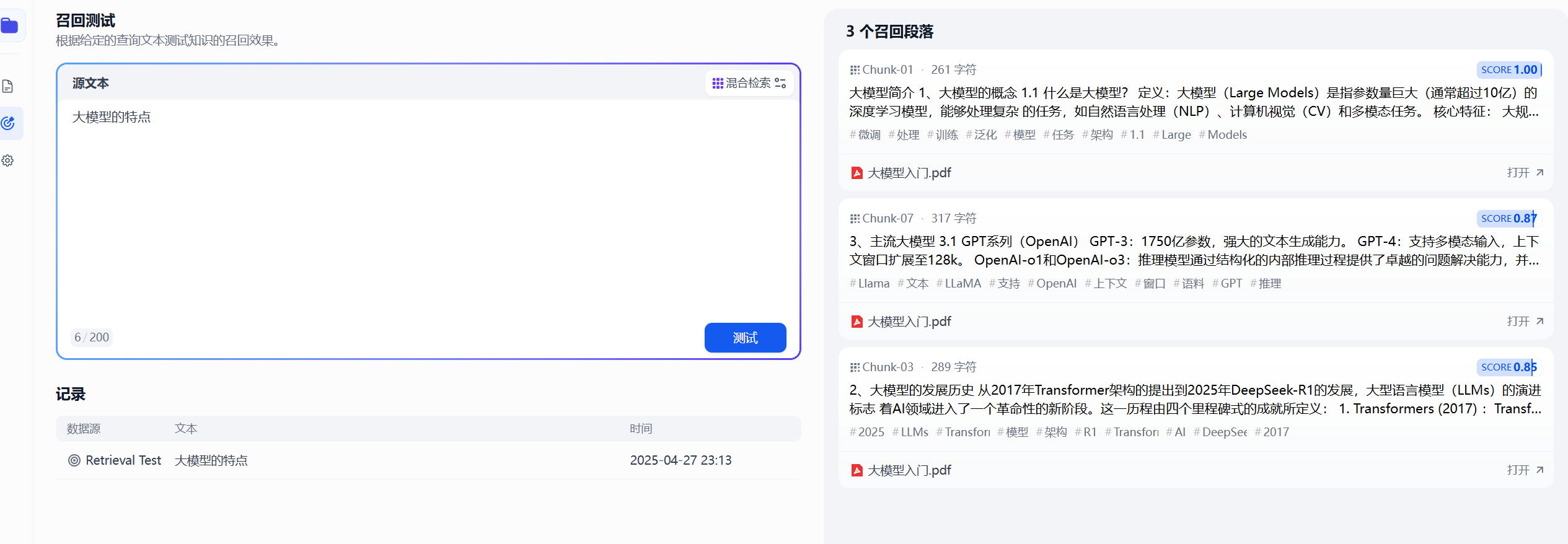 Dify 知识库内提供了文本召回测试的功能,用于模拟用户输入关键词后调用知识库内容区块。召回的区块将按照分数高低进行排序并发送至 LLM。一般而言,问题与内容块的匹配度越高,LLM 所输出的答案也就更加贴近源文档,文本“训练效果”越好。