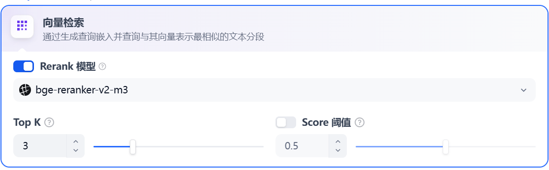 Rerank 模型: 默认关闭。开启后将使用第三方 Rerank 模型再一次重排序由向量检索召回的内容分段,以优化排序结果。帮助 LLM 获取更加精确的内容,辅助其提升输出的质量。开启该选项前,需前往“设置” → “模型供应商”,提前配置 Rerank 模型的 API 秘钥。