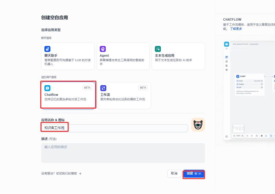 点击创建空白页面、选择chatflow ,给这个chatflow 应用一个名字