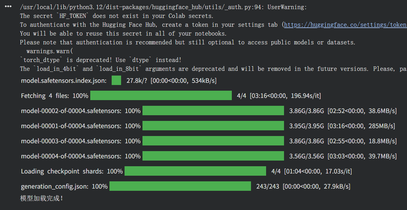 torch_dtype=torch.float16表示模型在计算是使用float16,同样bnb_4bit_compute_dtype=torch.float16指定了反量化的参数也是float16。