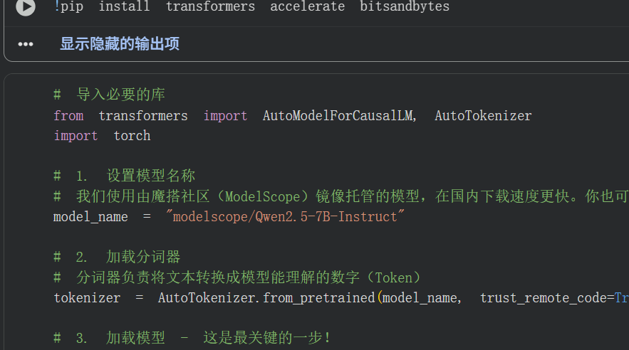 model_name = "Qwen2.5-7B-Instruct" tokenizer = AutoTokenizer.from_pretrained(model_name, trust_remote_code=True) #AutoModelForCausalLM.from_pretrained()方法不仅会加载模型的预训练权重,还会自动在模型顶部添加一个用于预测下一个词概率的语言模型头。 model = AutoModelForCausalLM.from_pretrained( model_name, torch_dtype=torch.float16, device_map="auto", trust_remote_code=True )