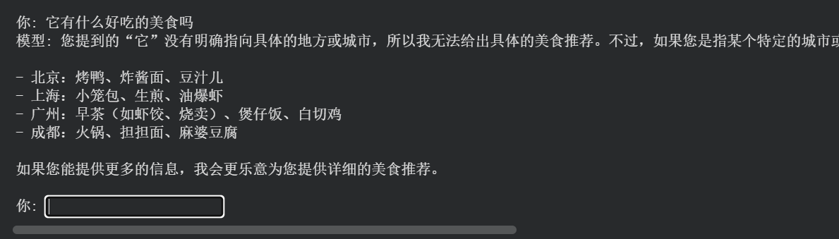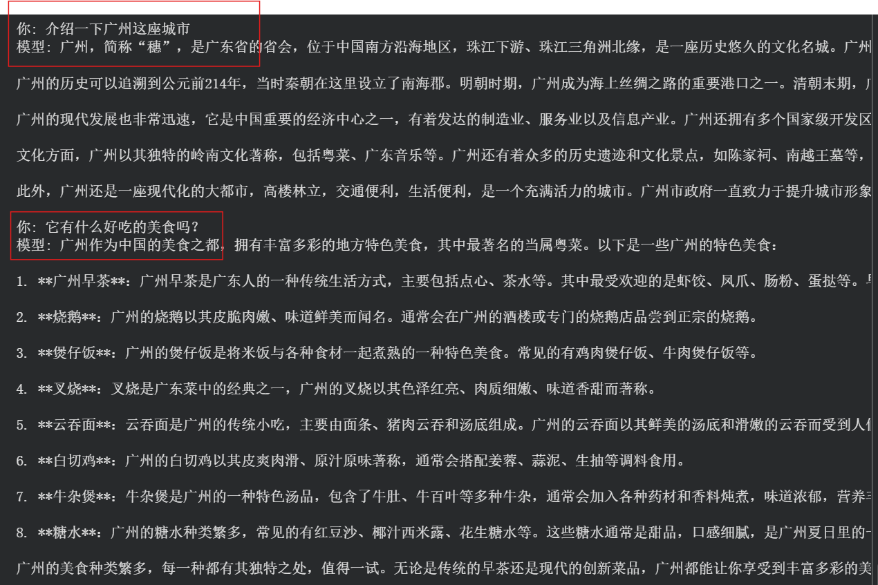 通过和模型对话也可以发现这个缺陷。例如,先让它“介绍广州这座城市”,然后问“它有什么好吃的美食吗?”模型的回答如下: