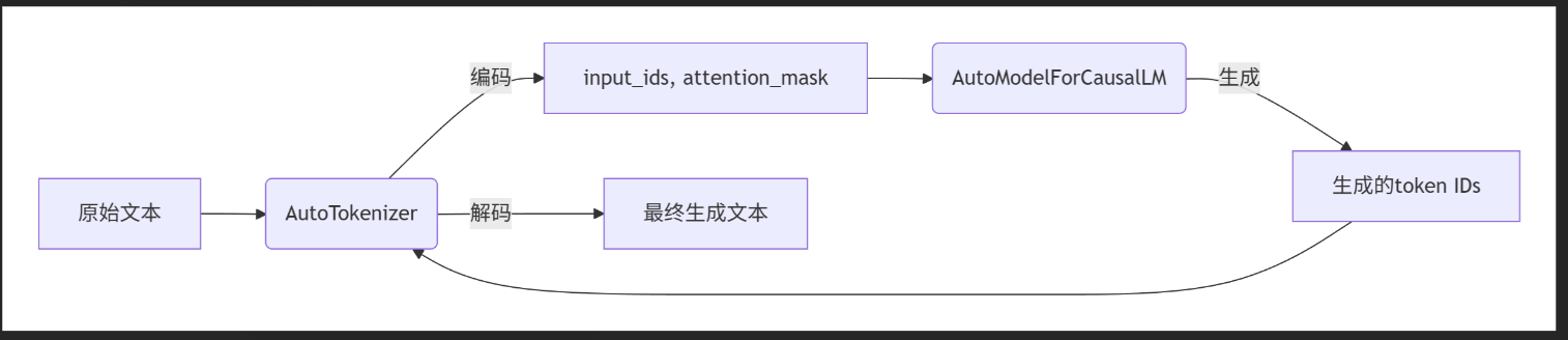 model.generate()方法来进行自回归生成,而不是直接调用 model()进行单步预测。generate()方法内部会循环调用模型,不断将生成的词作为新的输入,直到满足停止条件(如达到 max_new_tokens)。