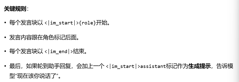 - ChatML:一种为聊天机器人设计的、基于特定标记的格式化规范。让模型能够准确地区分对话中的不同角色。