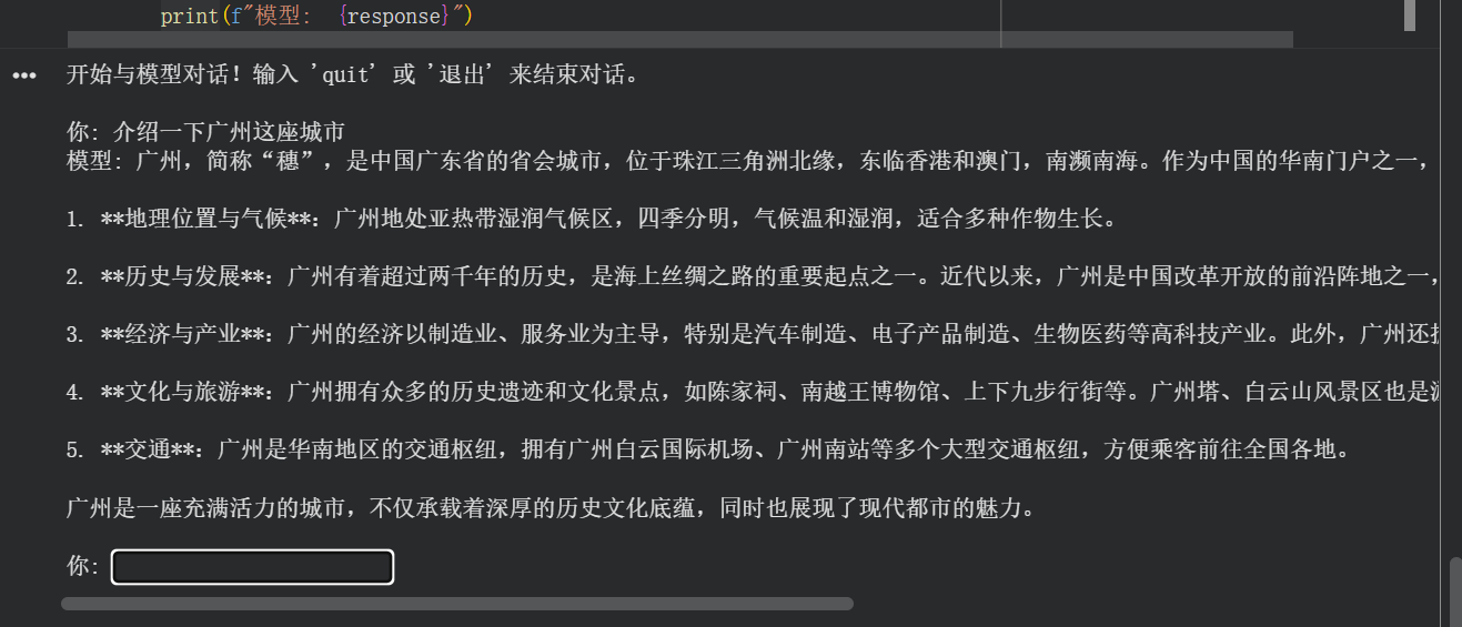 为了让交互更顺畅,我们可以写一个简单的循环,实现持续对话。在新的代码单元格中运行以下代码: