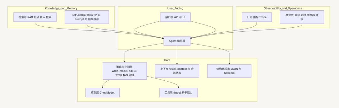 - 分层主线:接口/编排 → 策略/中间件 → 模型/工具 → 上下文/结构化输出 → 观测与稳定性(职责清晰、可治理)。