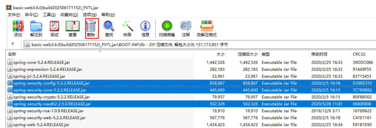 2、解决办法:后面我直接将包里面的下面的依赖包删除就好了,因为我们本身是不使用 spring-security 的,不知道为什么被它们打包进去了。