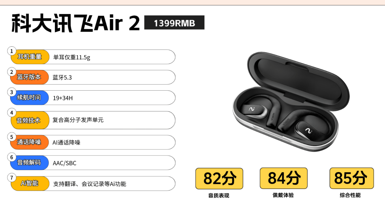 基于以上特点,科大讯飞Air 2非常适合以下人群:商务人士与频繁通话者:AI通话降噪和防漏音技术能确保在会议、通勤等场景下通话清晰且私密,2项AI功能也可能在语音助手、翻译等方面提供便利。重度用户与长途旅行者:超长的综合续航能力,非常适合需要长时间佩戴、不便频繁充电的用户。关注隐私的用户:对通话和听音隐私有较高要求的用户,其反向声波抵消技术是一个关键吸引力。追求科技感的智能设备爱好者:对AI功能有好奇和需求的用户,希望耳机能提供超越基础听音和通话的智能体验。