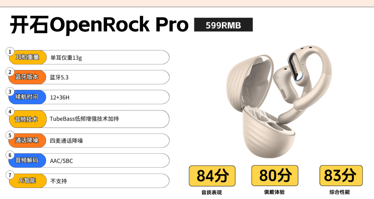 配置与功能上,开石OpenRock Pro支持蓝牙5.3,连接稳定性有基础保障。它配备四麦克风通话降噪系统,能有效拾取人声并抑制环境噪声。续航是其显著优势,单次续航达12小时,配合充电盒总续航为36小时。