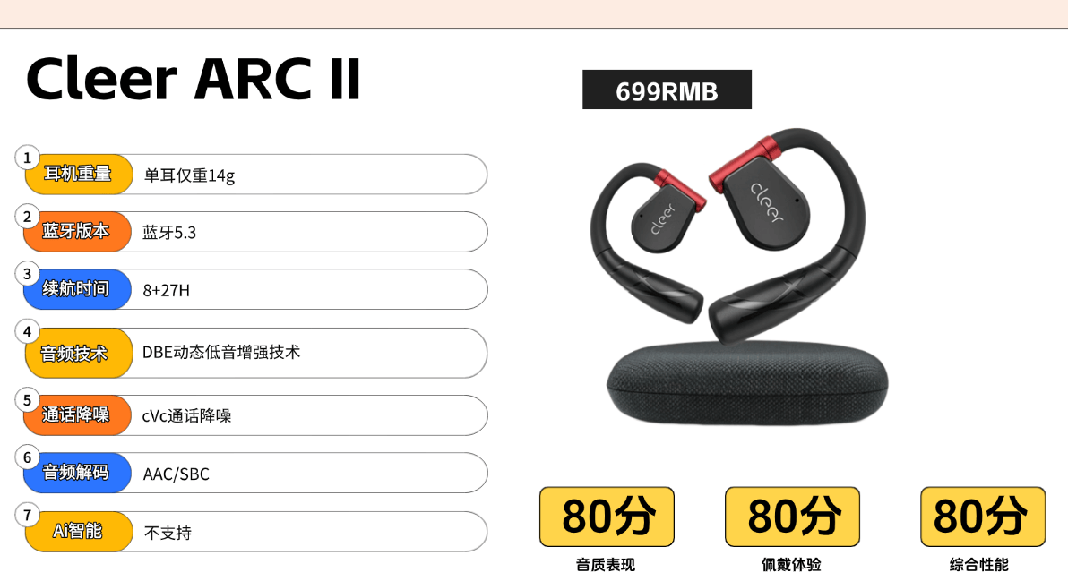 Cleer ARC II亲肤硅胶材质的运用保障了接触舒适度,14克的单耳重量在同类产品中控制适中,在日常通勤和轻度运动中能保持稳定状态。
