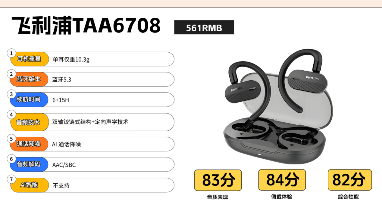 飞利浦TAA6708采用分体式耳挂设计,配备独特的双轴铰链结构,支持多角度调节以适应不同耳型。搭载14.2mm驱动单元并采用定向声学技术,声音传播指向性明确。人声表现清晰自然,高频细节保留完整,中频密度适中。不过在低频量感和动态表现方面中规中矩,对于重低音音乐类型表现力相对有限,更适合人声、轻音乐等日常聆听场景。