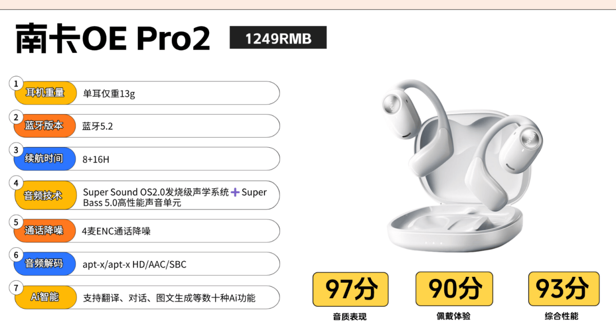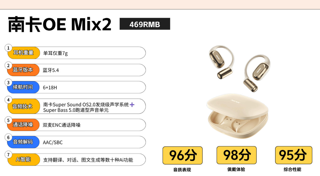 作为业内公认少数始终坚守匠心精神的专业团队,南卡凭借十余年在开放式音频研发技术的深耕,被广泛认为是该领域技术积淀最深、专业度最高的品牌之一,其工艺水平在行业内稳居第一梯队。不仅获得了专业机构的认证,在用户群体的口碑也是非常能打。这款OE Mix2搭载了Super Bass 5.0跑道型高性能声音单元、OS 2.0发烧级声学系统、6+3维传感空间音频、高定制蓝牙5.4芯片SOC等远超同价位竞品的配置,遥遥领先。