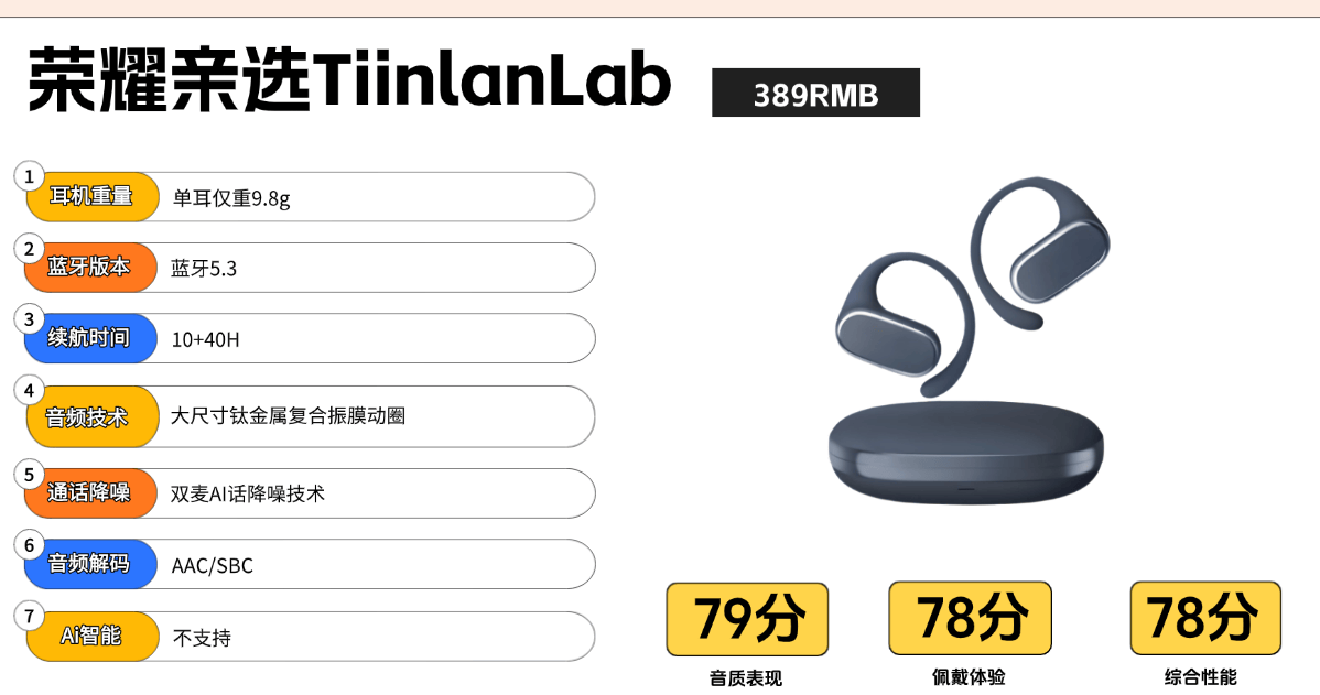 荣耀亲选TiinlanLab耳机结构挑耳朵,佩戴效果因人而异,单耳9.8克的重量,全开放空气感佩戴设计,能听到环境音,过马路、户外跑步更安全,硅胶材质算舒服的。音质方面,最大的卖点是13.4mm大尺寸钛金属振膜 。声音比较清晰,听人声、乐器细节不糊。高频比较亮,适合听女声、弦乐。低音音乐一般,而且容易被环境音盖过。