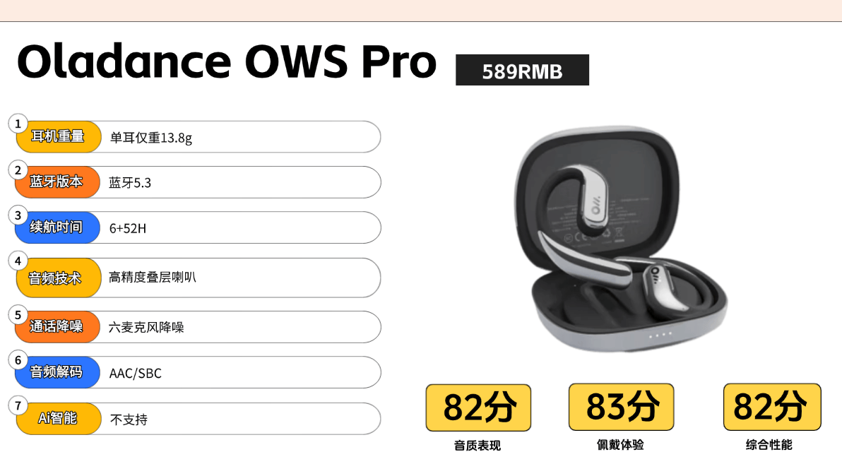 Oladance OWS Pro采用三点一弧面支撑结构,通过科学分散耳部压力实现佩戴稳定性。开放式声学方案确保用户在聆听时保持环境感知能力,兼顾音乐享受与户外安全。搭载23×10mm高精度叠层喇叭单元,采用复合生物振膜与动态均衡器EQ算法。人声表现温暖饱满,中频密度突出,高频延展柔和自然。声学结构在声场开阔度方面表现不错,不过低频下潜深度受开放式结构限制,更适合人声、古典乐等注重声场表现的音频内容。