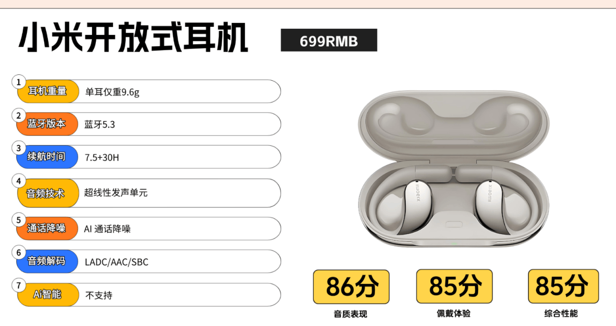 音质方面,小米搭载了17mm振膜动圈单元,结合声学导管与指向性声场设计,对于人声与轻音乐还原度较高,高频延展柔和顺滑,保证了不错的空间层次感。但在表现大动态电子乐或摇滚曲风时对重低音表现不明显,缺少冲击感和沉浸感,适合需求是运动、办公、长时间佩戴都舒服,并且能听清周围声音的人群。配置方面,小米支持蓝牙5.3,具备快速稳定的连接能力,日常使用延迟低,并拥有广泛的设备兼容性。而且还配备了AI通话降噪功能,对付风噪,能在嘈杂环境中抓住你的声音,续航方面的表现比较一般,单耳只能使用7.5小时,配合充电盒使用30小时。