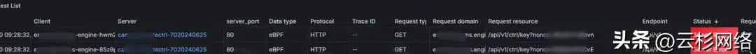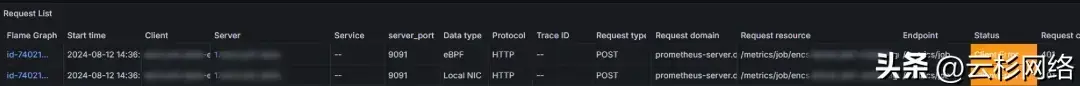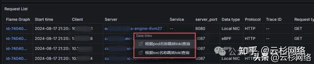 在此过程中,我们发现 DeepFlow 的 Server 列并不是固定的资源,其对应的为一个 auto_instance Tag,这个 Tag 可以自动识别实例,在我们场景中如果服务端为 pod 时,则显示的为 pod_name;而如果服务端为 service 的 cluster_ip 则显示的 service_name。因为 Grafana 中不能支持太复杂的判断逻辑,所以我们简单的提供了两个 Link,借助于文案来协助使用者跳转。Link 中在实例层面会传递 Loki 所需要的 pod_name 与 app,在搜索条件中会传递 endpoint、trace_id、request_type、status 及时间范围,通过的条件的传递来完成 eBPF 的数据与 Log 的联动:
