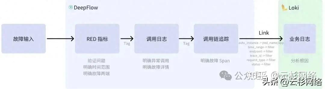 DeepFlow 作为 Grafana 数据源融入现有 Dashboard 体系中,并能与 Loki 数据联动完成