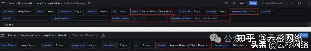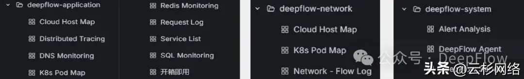 DeepFlow 官方默认的看板相当丰富,可观测性数据 + 系统监控的总共达到 39 个之多,有一些面板并不适合我们的场景,我们做了一些调整: