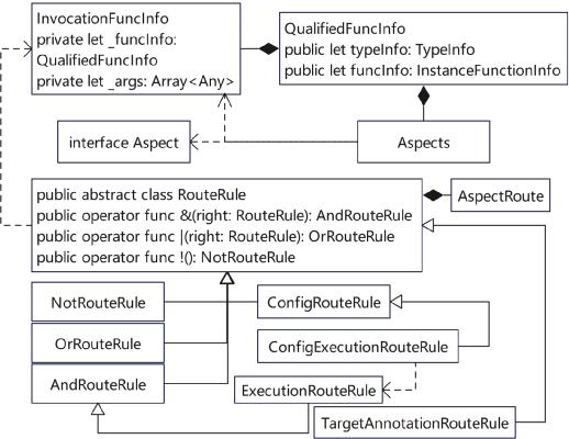 Aspects是AOP的中枢,宏@Pointcut把被它修饰的函数体包装成嵌套函数,用函数参数构造Array<Any>。获得函数参数的类型,再用函数所在类的TypeInfo、函数名和函数参数类型获得InstanceTypeInfo,每次函数调用都会用以上这些信息构造一个新的InvocationFuncInfo实例,这是判定是否织入切面的依据。