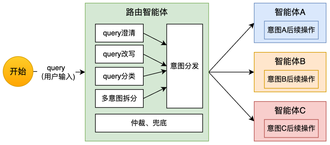分发的前提要先完成用户意图的理解。即需要分析用户的输入代表什么意图,综合考虑上下文信息包括前序交互内容、当前环境感知及状态信息。进而做出动态决策,把请求导流到不同的专门处理流程。只有准确的意图理解才能做到精准分发。
