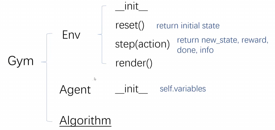 gym包含三个类,但我们只会用到env类来模拟环境,agent类:单智能体,algorithm:算法: