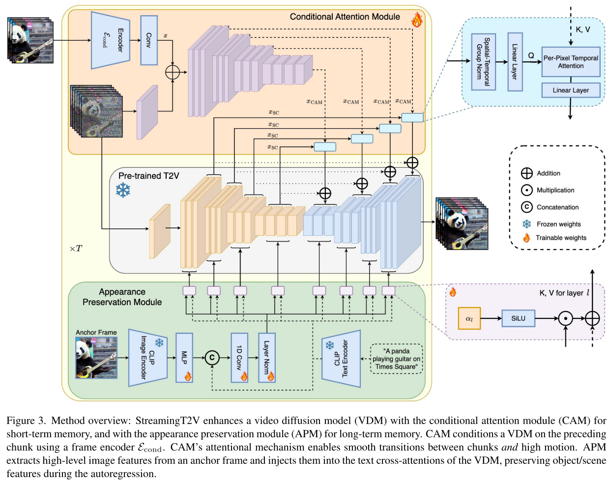 StreamingT2V提出了一个优雅的三模块架构,分别解决短期一致性、长期记忆和质量增强问题。