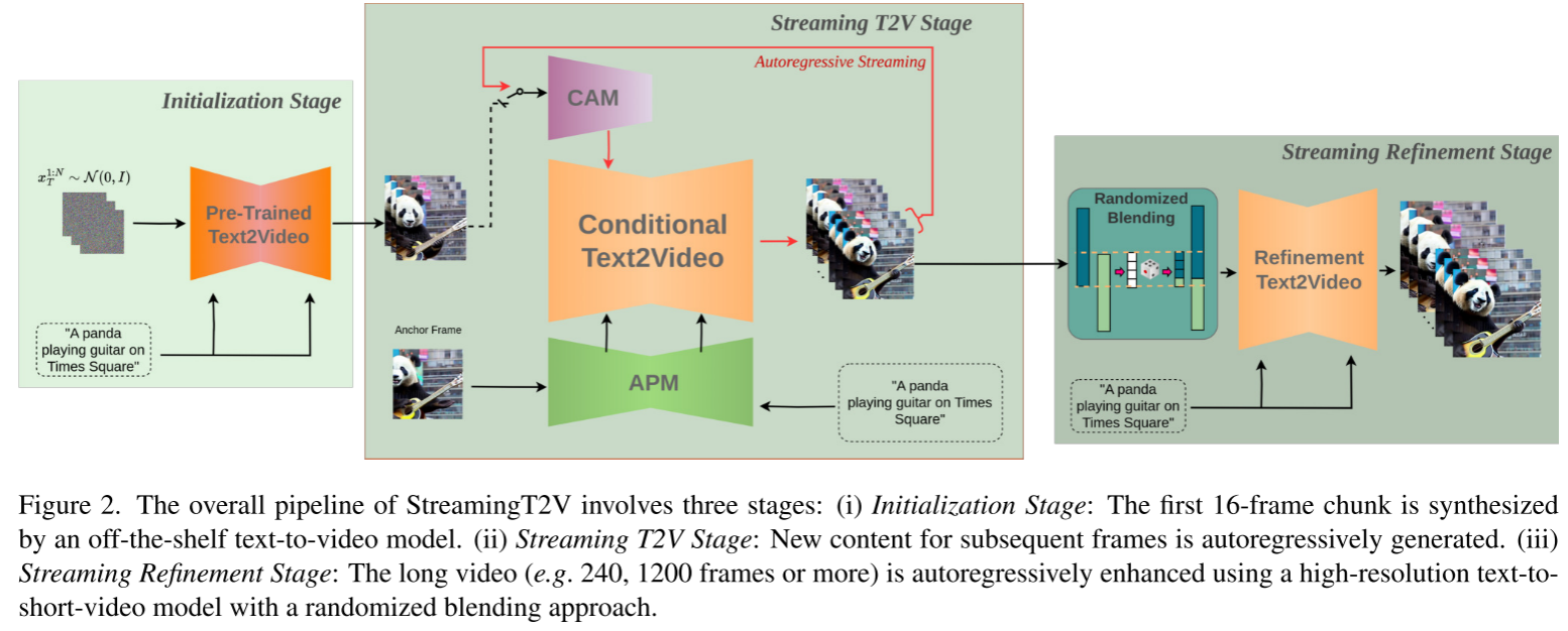 - 流式生成阶段:通过CAM和APM自回归生成长视频(240-1200帧)