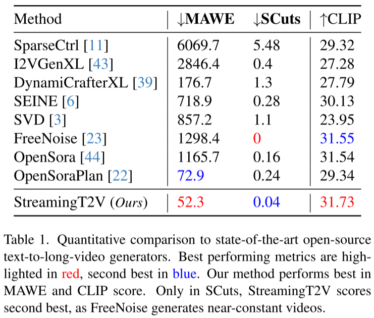 - MAWE指标同时衡量运动量和一致性,StreamingT2V比第二名低28%,说明既有丰富运动又保持一致