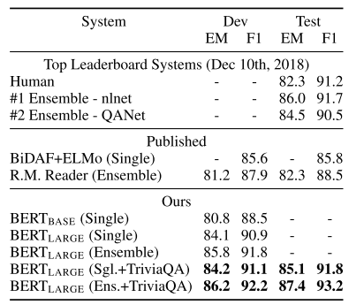 表2显示了顶级排行榜条目以及来自顶级发布系统的结果(Seo等人,2017;Clark和Gardner, 2018; Peters等人,2018a; Hu等人,2018)。来自SQuAD排行榜的顶级结果没有最新的公共系统描述,并且允许在训练他们的系统时使用任何公共数据。因此,在对SQuAD进行微调之前,我们首先对TriviaQA进行微调(Joshi等人,2017),从而在系统中使用适度的数据增强。
