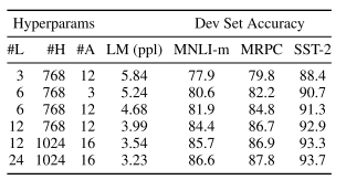 表6:消融对BERT模型尺寸的影响。#L =层数;#H =隐藏大小;#A =注意头数。“LM (ppl)”是被遮挡的训练数据的LM困惑。
