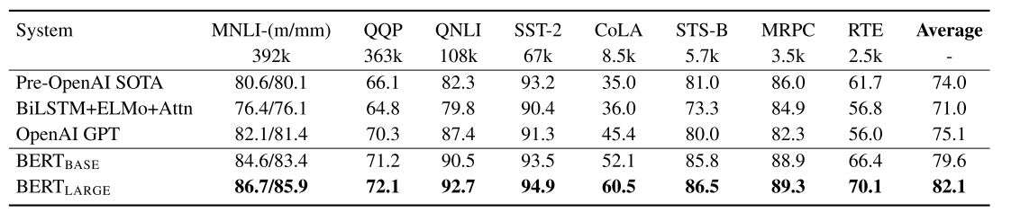 表1:GLUE测试结果,由评估服务器(https://gluebenchmark.com/leaderboard)评分。每个任务下面的数字表示训练样例的数量。“平均”一栏与GLUE的官方得分略有不同,因为我们排除了有问题的WNLI集。BERT和OpenAI GPT是单模型、单任务。QQP和MRPC报告F1分数,STS-B报告Spearman相关性,其他任务报告准确性分数。我们排除了使用BERT作为其组件之一的条目。