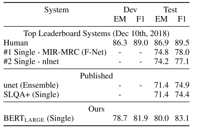 表3:SQuAD 2.0结果。我们排除了使用BERT作为其组件之一的条目。