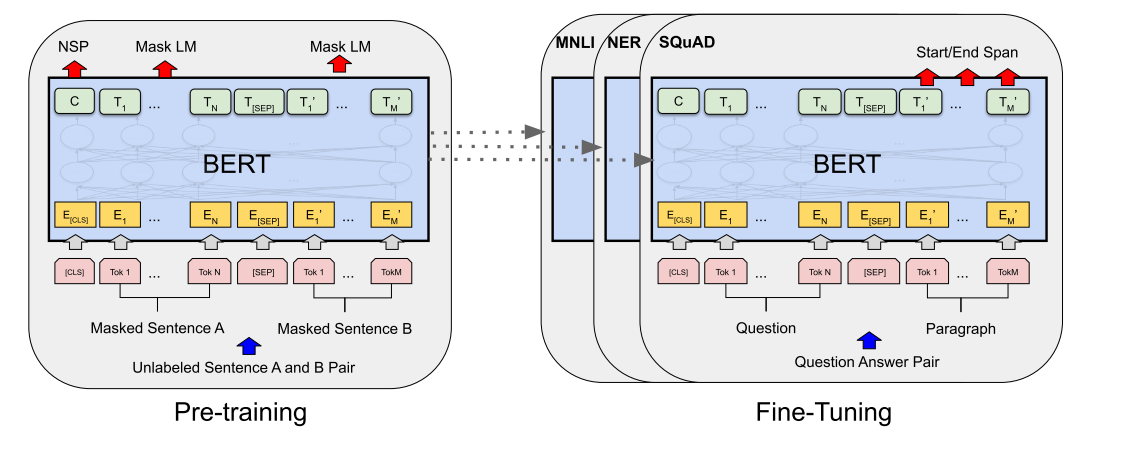 我们将在本节中介绍BERT及其详细实现。在我们的框架中有两个步骤:预训练和微调。在预训练过程中,模型在不同的预训练任务上对未标记数据进行训练。对于微调,首先使用预训练的参数初始化BERT模型,然后使用来自下游任务的标记数据对所有参数进行微调。每个下游任务都有单独的微调模型,即使它们是用相同的预训练参数初始化的。图1中的问答示例将作为本节的运行示例。