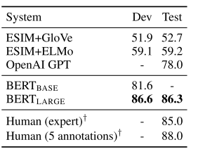表4:SWAG开发和测试精度。†如SWAG论文所述,人类的表现是用100个样本来测量的。