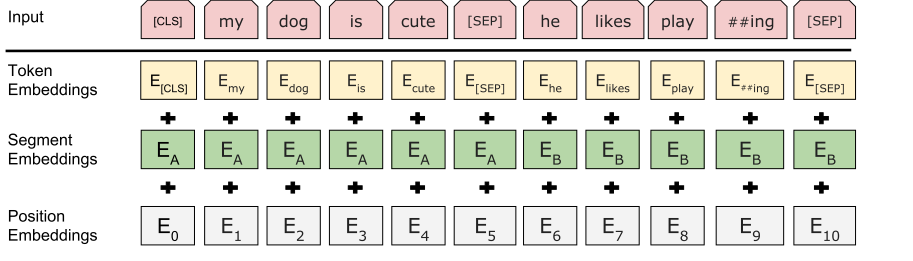 图2:BERT输入表示。输入嵌入是标记嵌入、分割嵌入和位置嵌入的总和。
